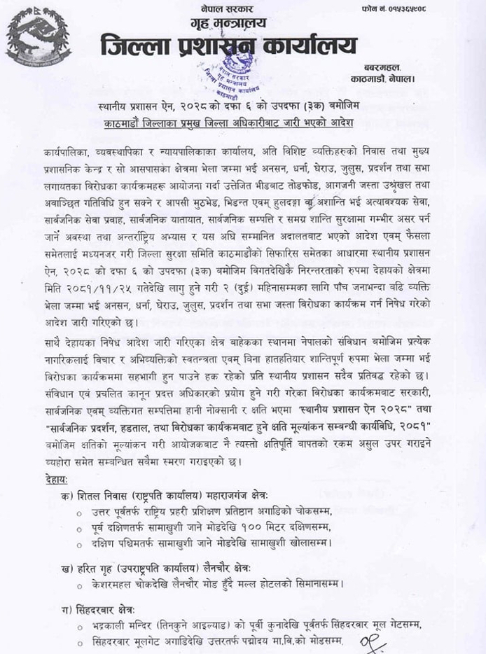 राष्ट्रपति र उपराष्ट्रपति कार्यालय वरपर, सिंहदरबार, प्रधानमन्त्री निवास बालुवाटार र संसद् भवन वरपरका क्षेत्रमा निषेधाज्ञा जारी भएको जिप्रका काठमाडौंले जनाएको छ ।